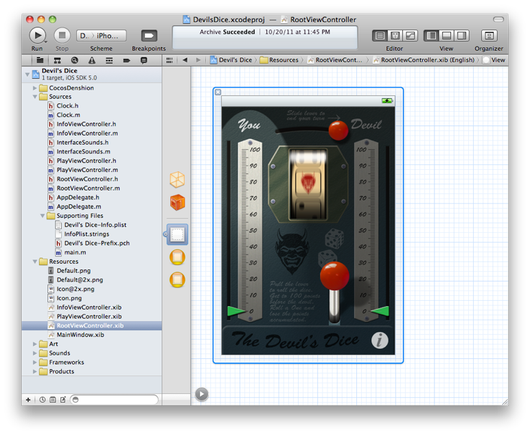 There are three view controllers. RootViewController is the primary controller — most of the game state machine and logic are in here. The PlayViewController is brought up to display the game stats and handling the “Player vs. Devil” and “Player vs Player” buttons. The InfoViewController displays the rules and sound volume setting.